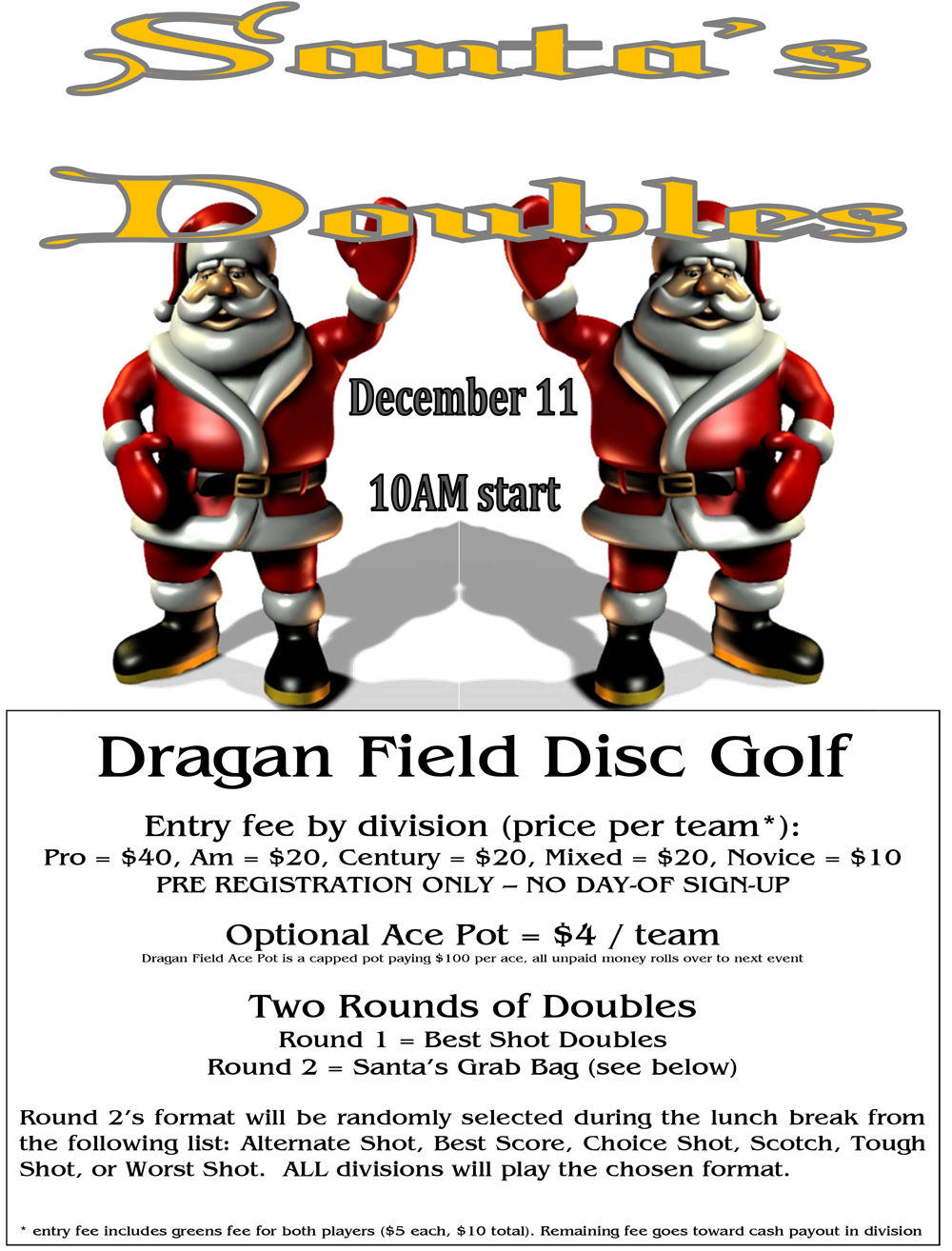 Santa’s Doubles is a Christmas themed tournament that dates back in various formats to 2004. A Christmas gift exchange is traditionally part of the festivities. The current format involves one round of best shot doubles and a second round called “Santa’s Grab Bag” in which the doubles format played by all divisions in round 2 is randomly selected during the lunch break.
